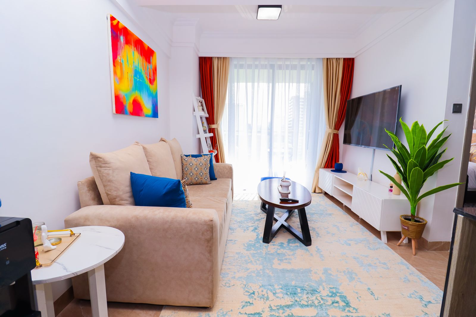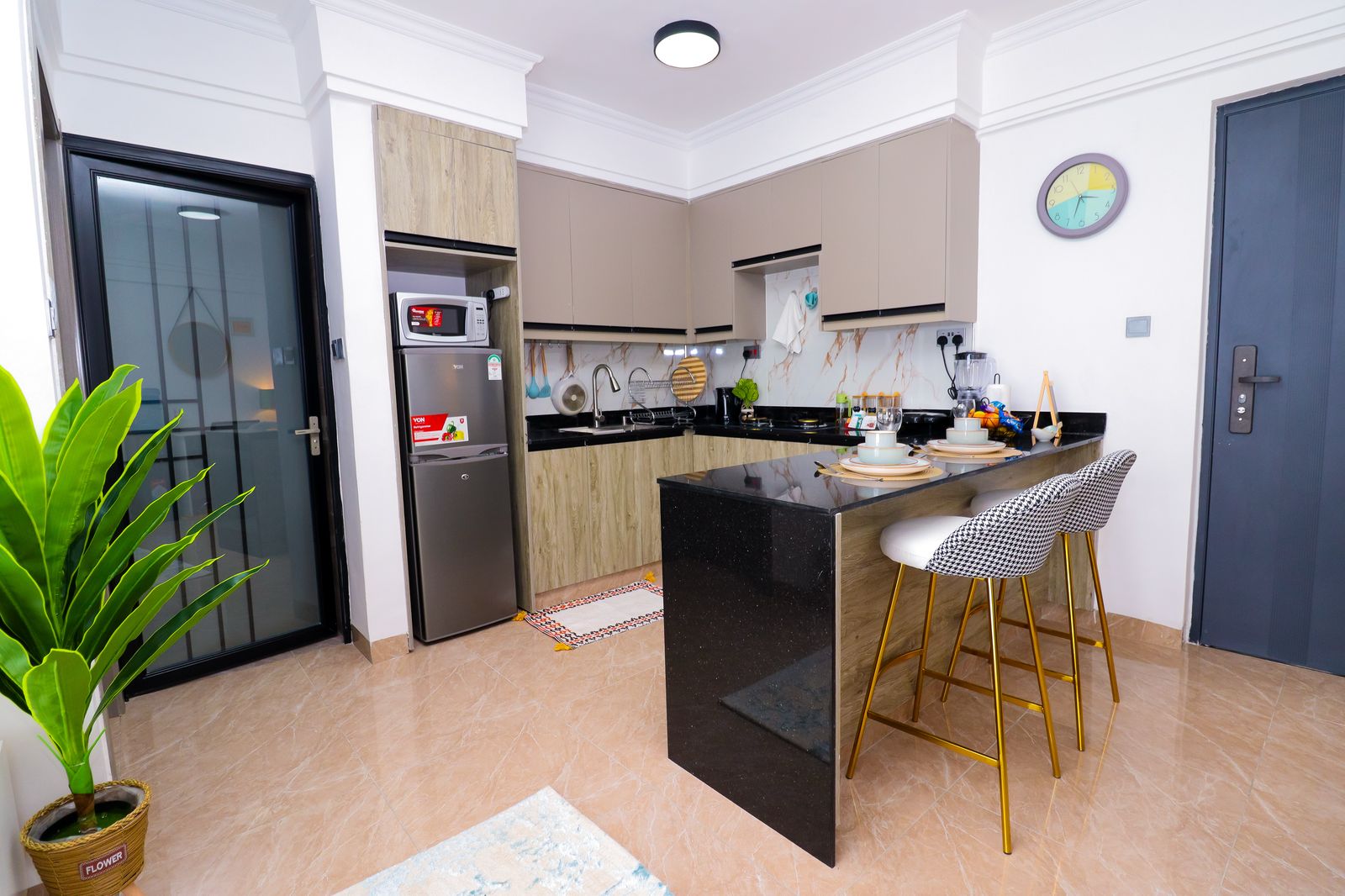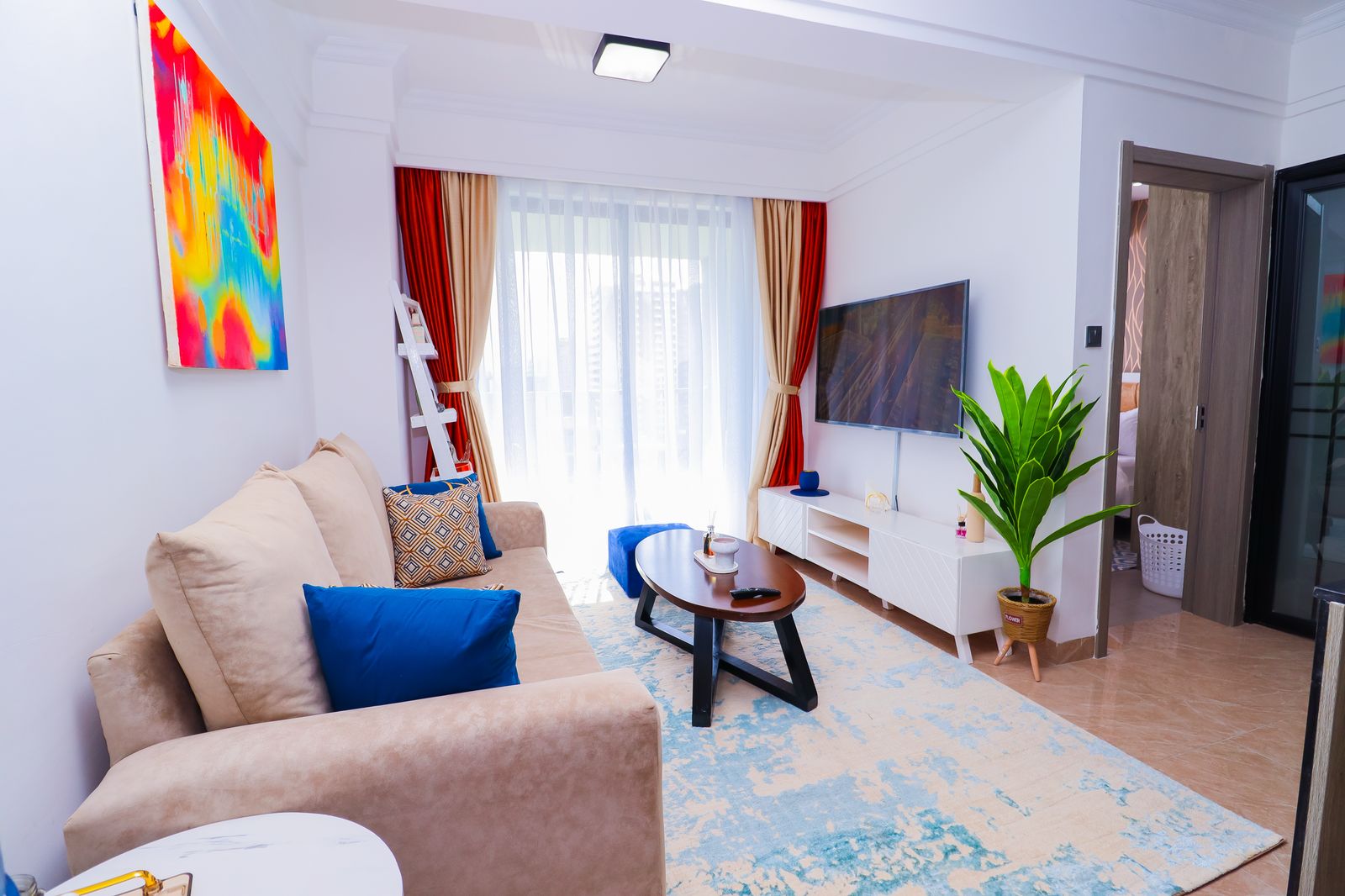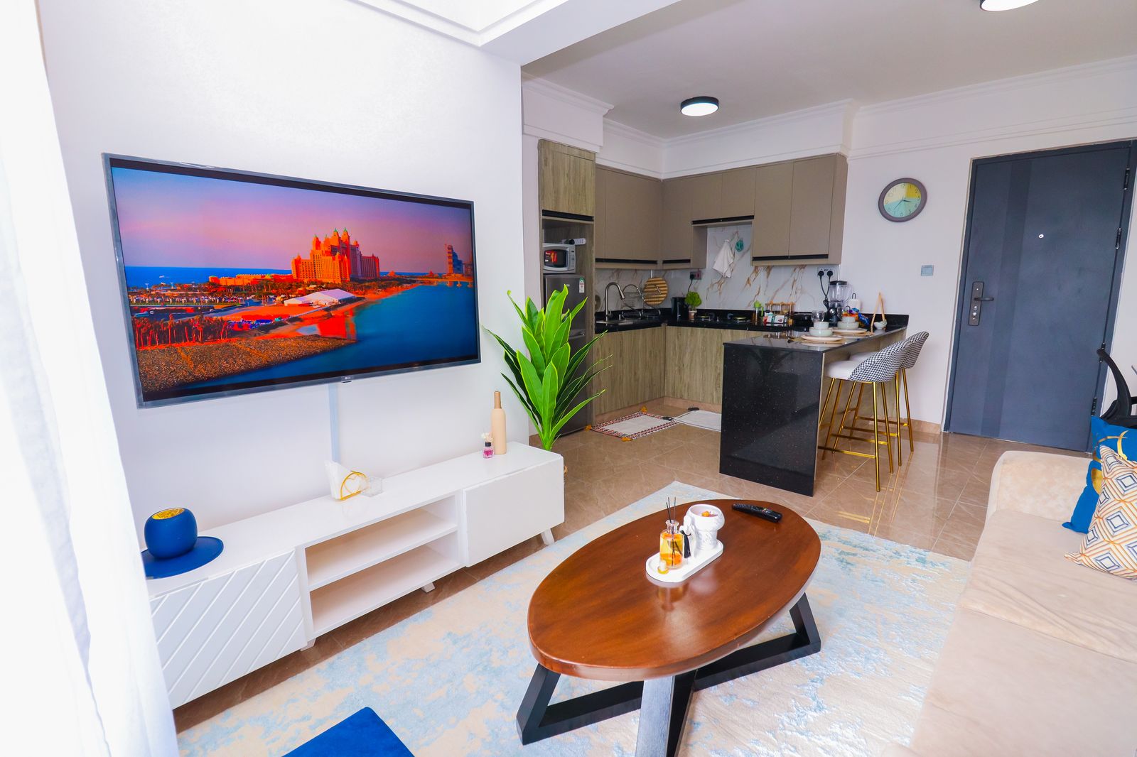 Enjoy serenity in this luxe space. Modern 1BR with Chic amenities, Sunset Views & Charm. Comes with a stunningly furnished living room with a 55″ HDTV, fully equipped kitchen, cozy bedroom, comfy office space, an airy private balcony & a modern bathroom. Kitchen & Bathroom essentials available on site for your absolute convenience. Free WIFI. Close proximity to Yaya Center, Carrefour Market, easy access to CBD, Ngong Road, Kilimani & all other social amenities; Eateries,Entertainment joints etc