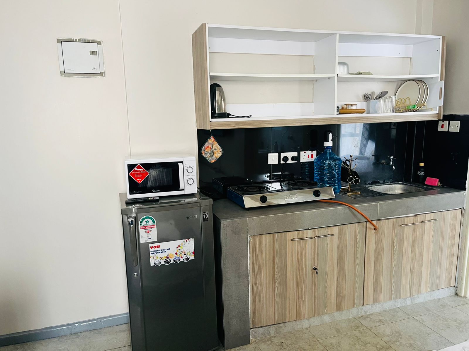 2. Open-plan kitchen fitted with a fridge, microwave, 2-burner gas cooker, utensils, and ample cabinet space.