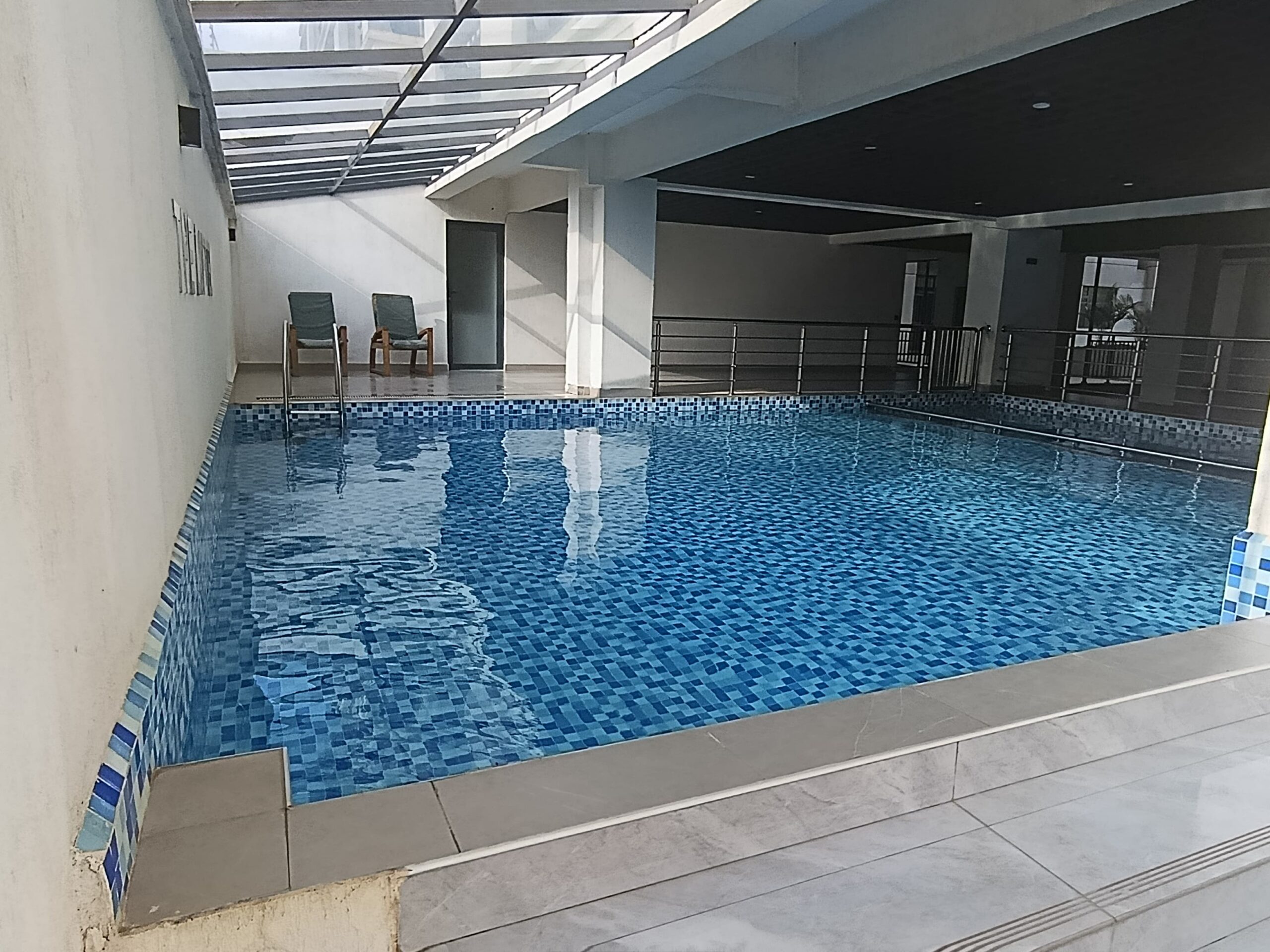 Guests enjoy access to premium shared amenities including a swimming/plunge pool, fully equipped gym, high-speed lifts, backup power, borehole water, solar water heating, ample parking, and 24/7 security with CCTV and controlled access.