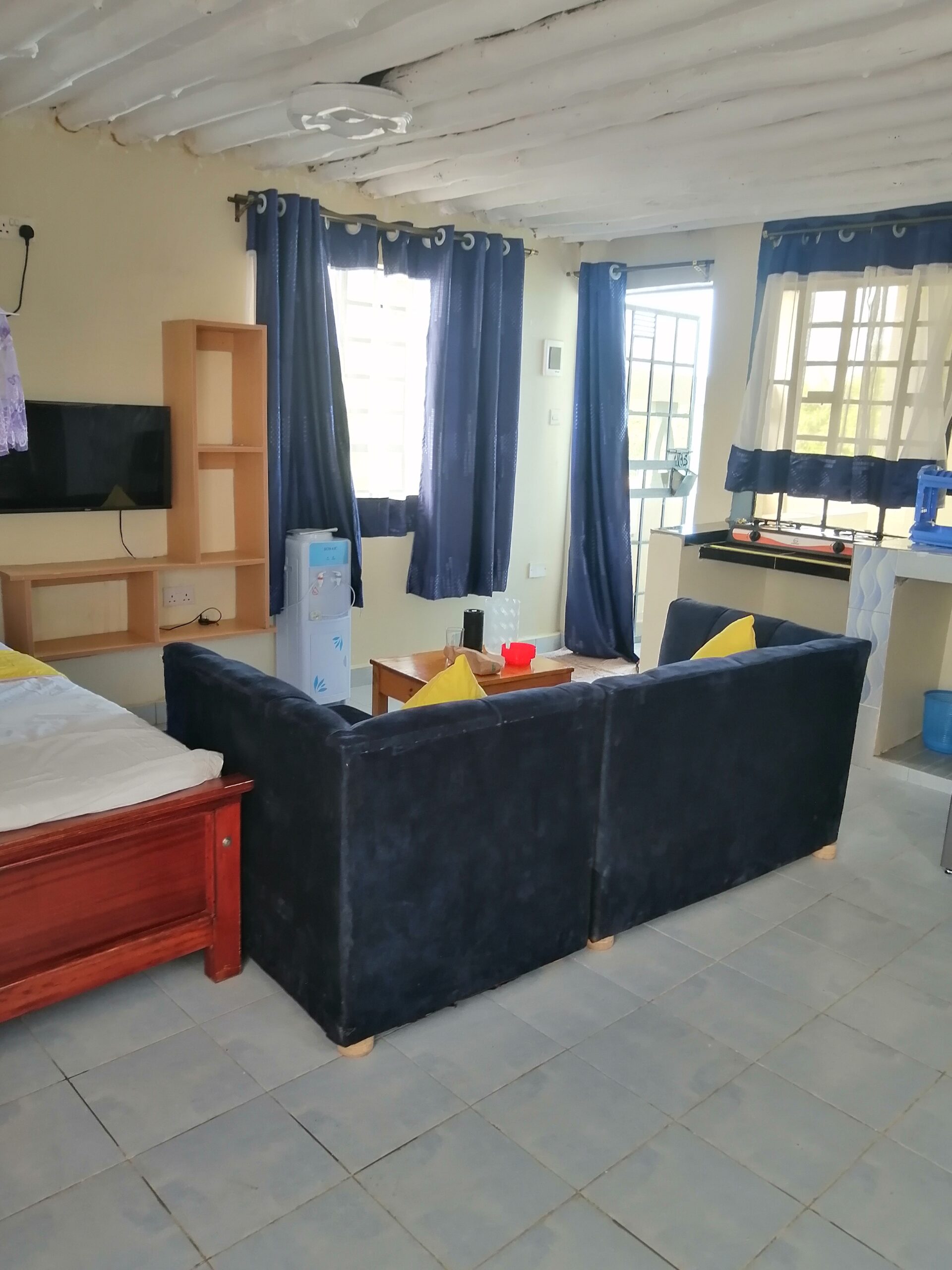 Tastefully furnished studio, walking distance to the Diani Airport and Diani Beach. Private swimming pool and parking available